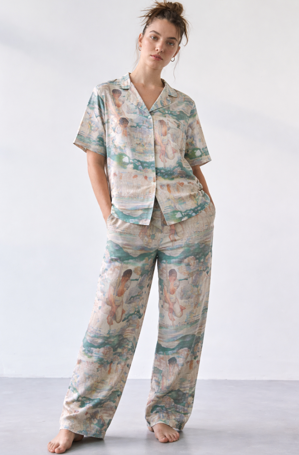 A modern essential elevated through art. This lounge pant blends relaxed tailoring with a rich, painterly print inspired by classic masterpieces, creating a piece that feels both cultured and effortless. The soft drape and easy fit offer all-day comfort, while the expressive artwork brings depth, story, and individuality to a clean silhouette. Designed for a contemporary wardrobe, it’s where comfort meets quiet sophistication—made to stand out without trying too hard.